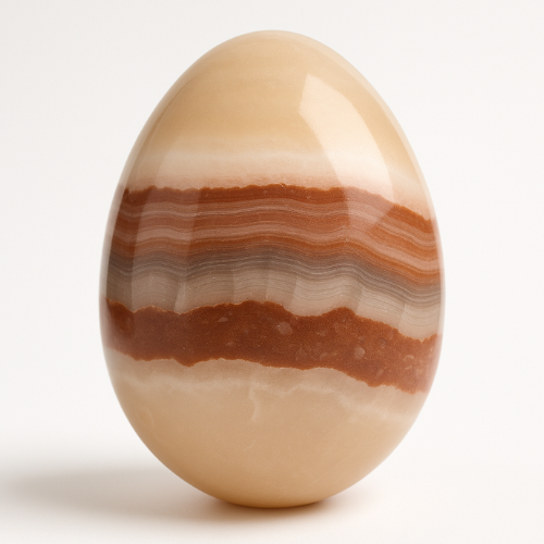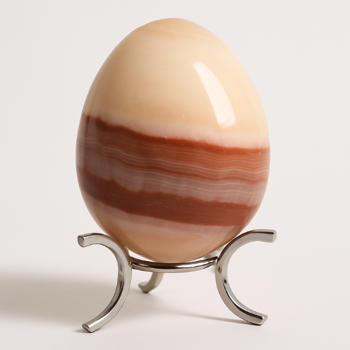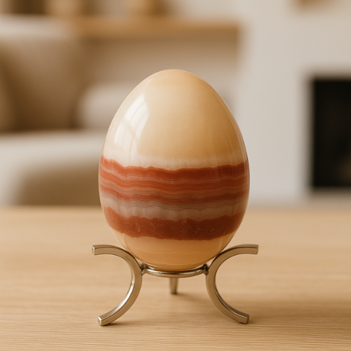 Huevo de ónix natural tallado y pulido a mano. Sus vetas únicas crean una pieza decorativa elegante y auténtica, ideal para armonizar tu espacio. El ónix es conocido por brindar protección y estabilidad energética.